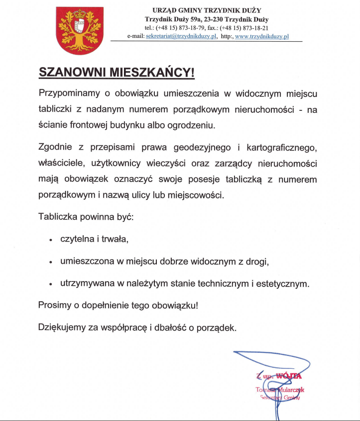 Zgodnie z przepisami prawa geodezyjnego i kartograficznego, właściciele, użytkownicy wieczyści oraz zarządcy nieruchomości mają obowiązek oznaczyć swoje posesje tabliczką z numerem porządkowym i nazwą ulicy lub miejscowości.